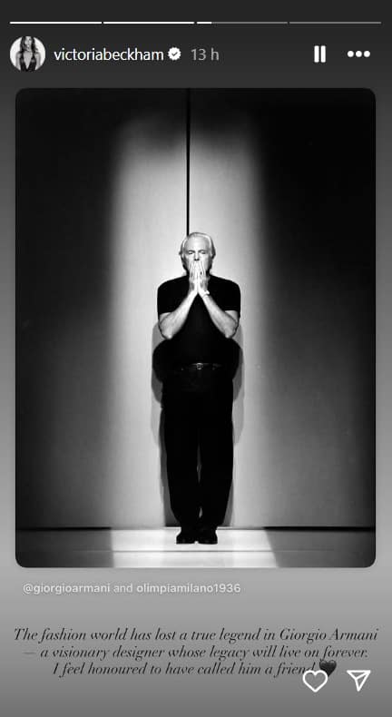 "The fashion world has lost a true legend in Giorgio Armani a visionary designer whose legacy will live on forever," Victoria wrote on her Instagram Stories Sept. 4. "I feel honored to have called him a friend." Despite Armani's long-running commercial rivalry with the Versace family, Donatella expressed her sympathies on Instagram, writing, "The world lost a giant today. He created history and will be remembered forever."